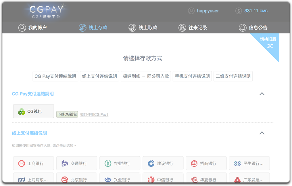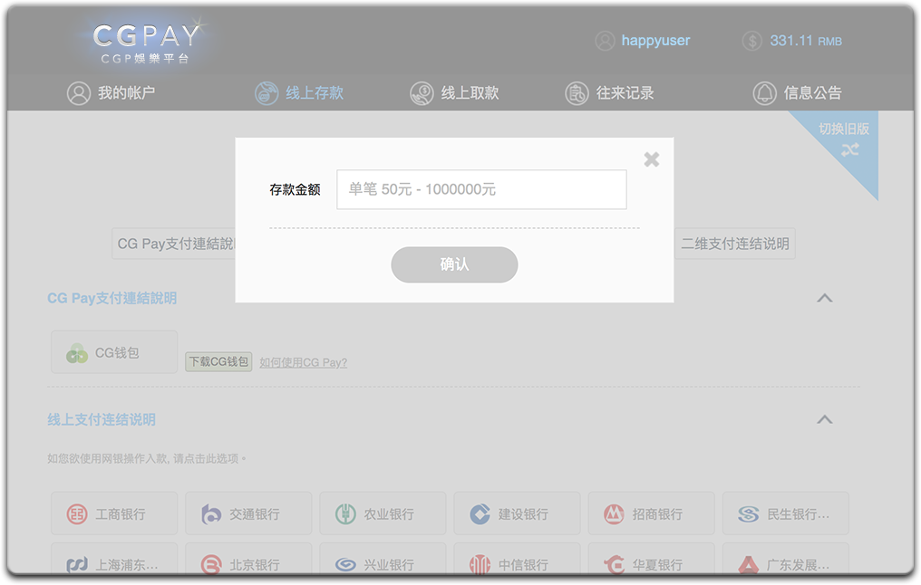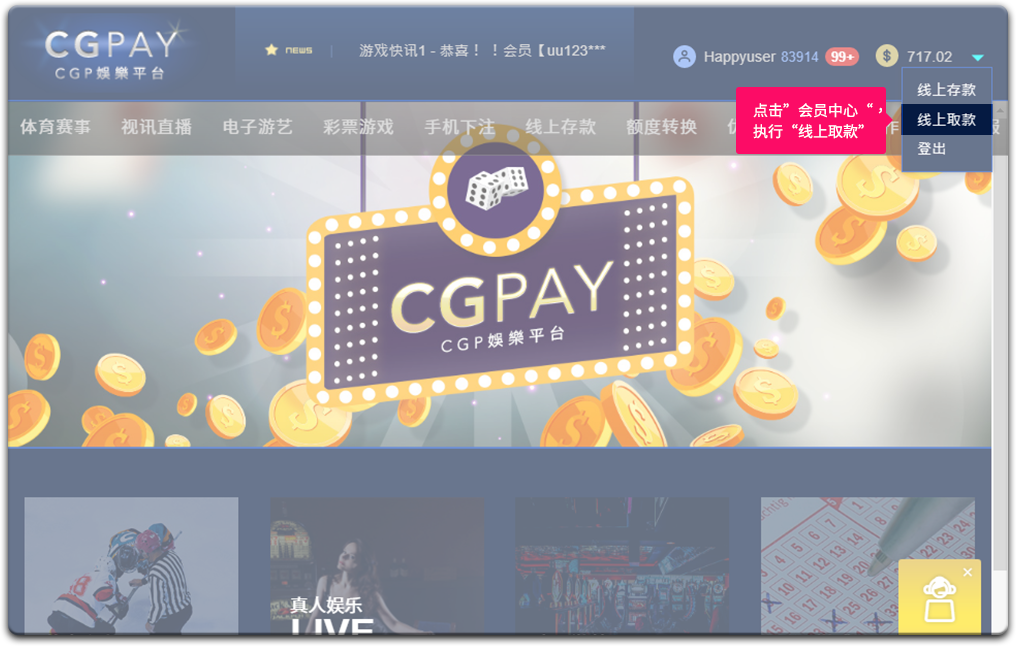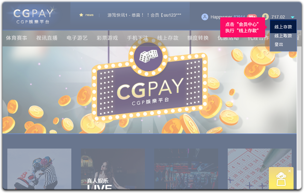 Step 1 Step 2 Step 3 Step 4 Step 5 Step 1选择线上存款 Step 2选择CG钱包 Step 3输入存款金额 Step 4扫描支付连结 Step 5上分完成!! 上一步 分享 下一步