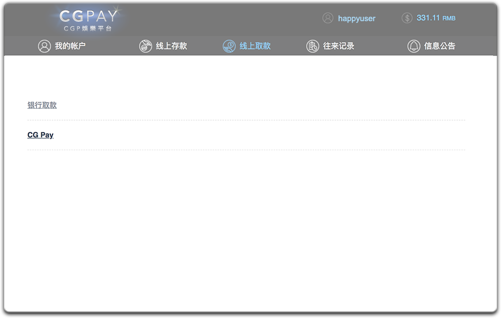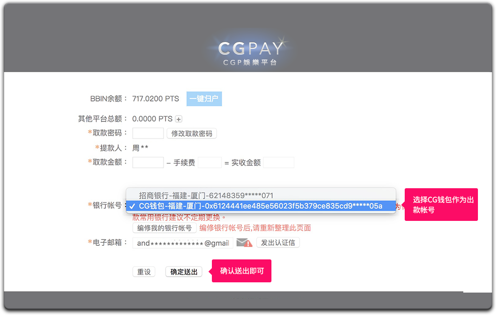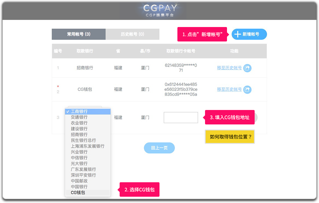 Step 1 Step 2 Step 3 Step 4 Step 5 Step 1选择线上提款 Step 2选择CGay Step 3新增cg钱包作为出帐地址 如何取得錢包位置? Step 4选择银行帐号 Step 5申请成功 上一步 分享 下一步